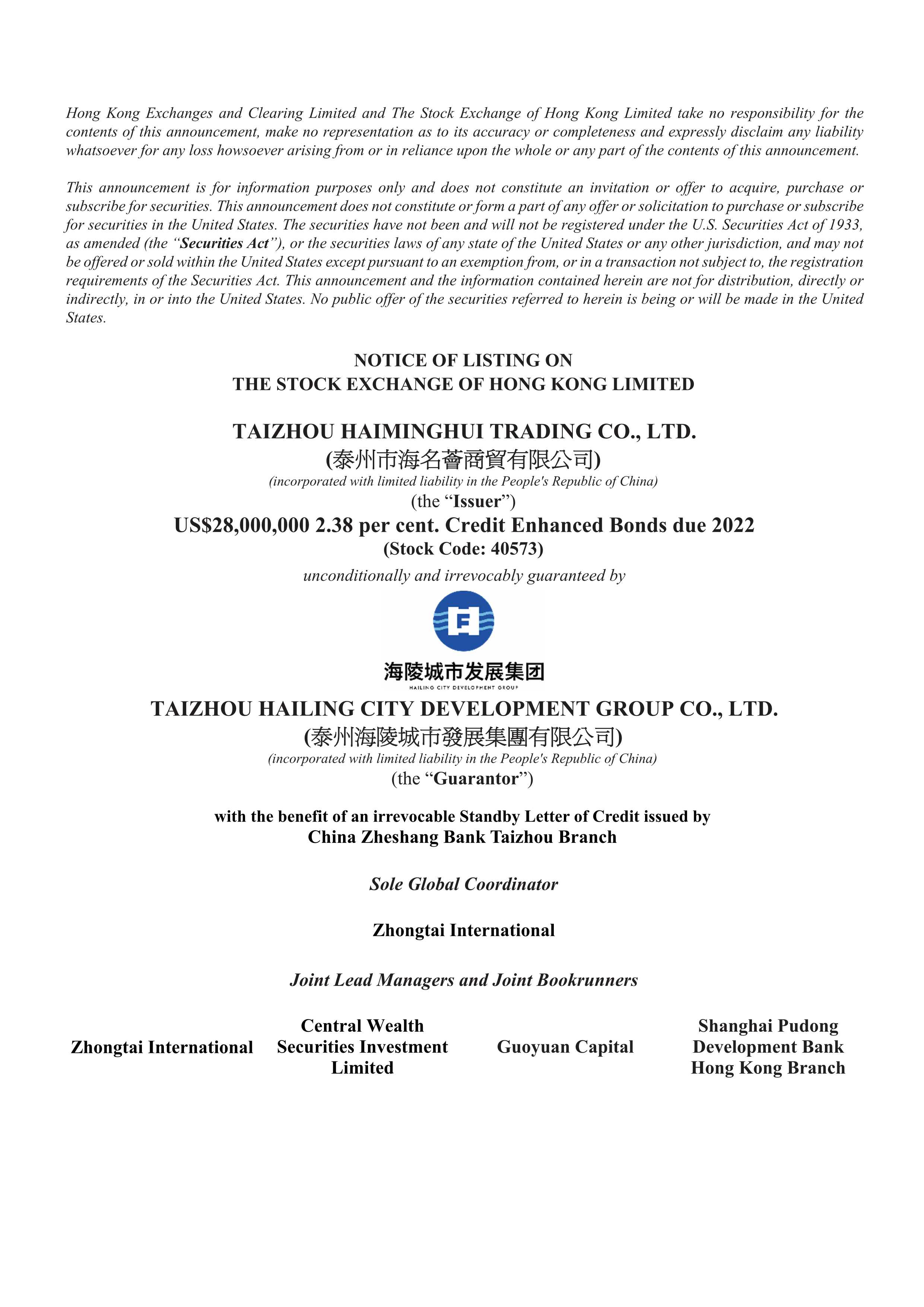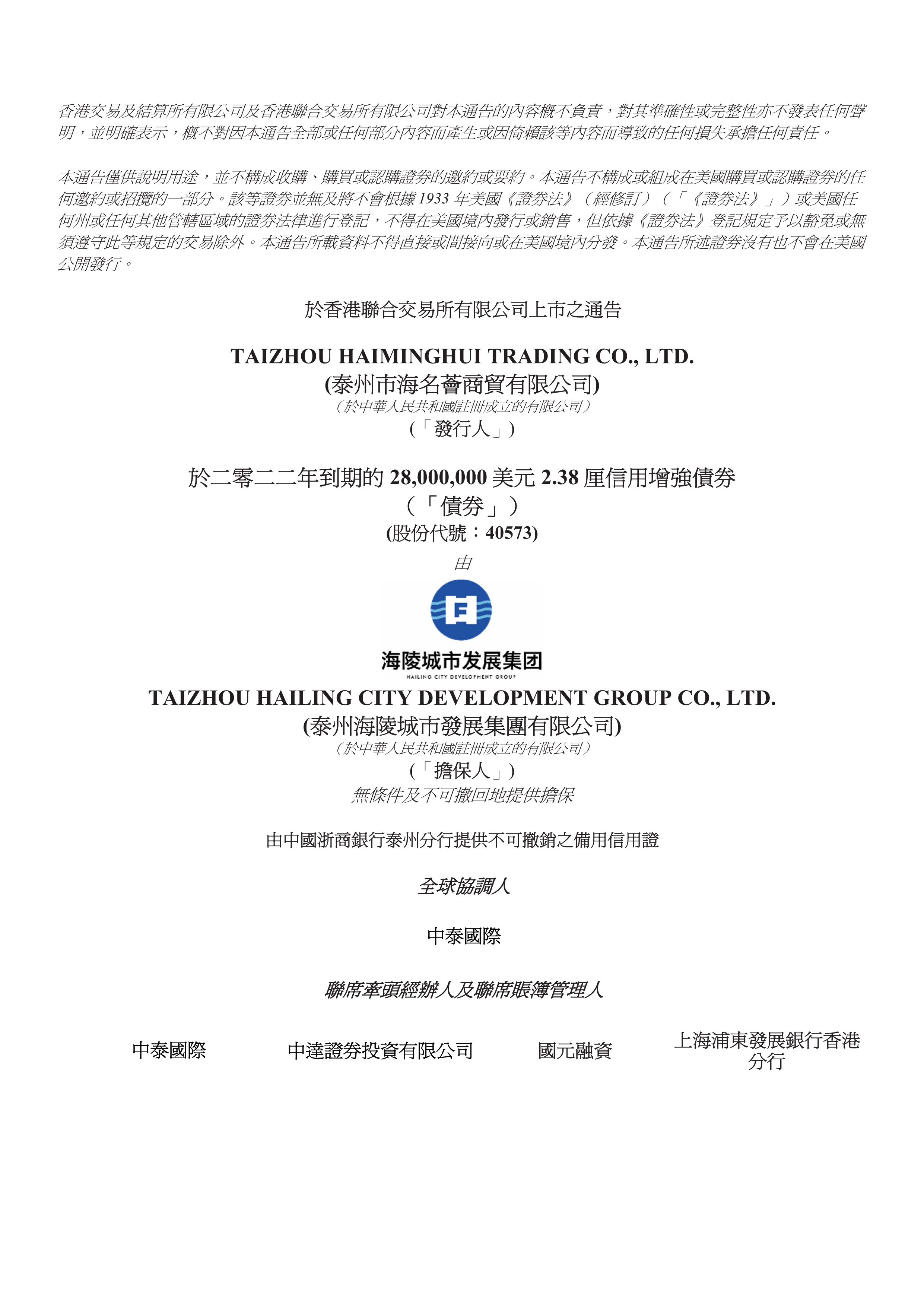 海名薈首單境外美元債券香港聯(lián)交所上市公告